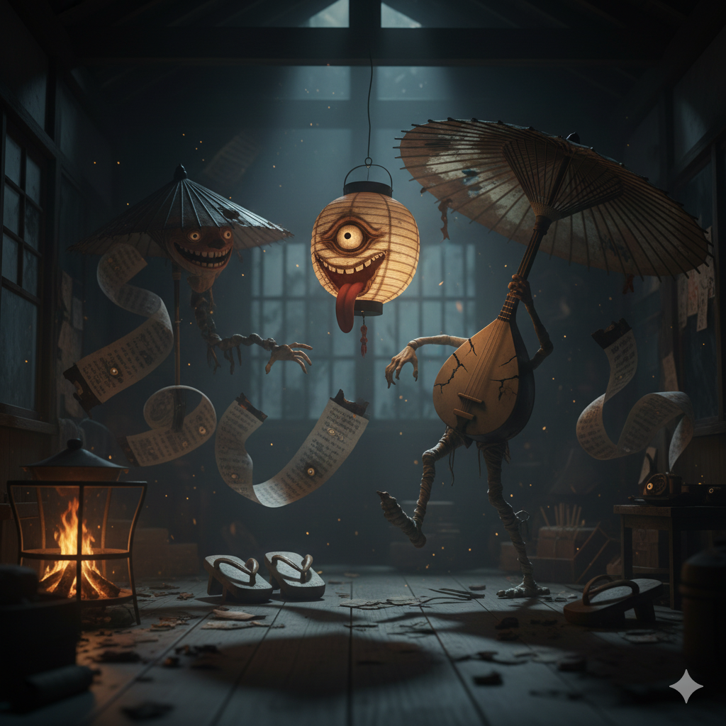 Há yōkai que se escondem dentro de objetos. Ferramentas antigas, lanternas, guarda-chuvas esquecidos por décadas podem despertar e se transformar em Tsukumogami. Eles não atacam imediatamente. Observam aqueles que os descartaram. O ressentimento, acumulado ao longo dos anos, se manifesta quando menos se espera. É o terror do abandono transformado em vingança.